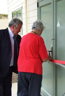 14 December 2011 - Betty Pennell (deputising for Society Patron Ethel Pickering) watched by Hiku Cherrington (Chairman of the Society) cutting the ribbon to celebrate the official opening of the new Museum and Archives Centre - photo courtesy of Owen Whaley |
