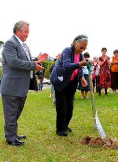 11 November 2010 - Society Patron Ethel Pickering watched by Hiku Cherrington (Chairman of the Society), turns the first sod at the site of the new premises of the Society at Omapere - photo courtesy of Richard Edmondson, Northern News. |