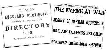 Frontspage, Cleave's 1915 Auckland and Provincial Directory. Leader article from the New Zealand Herald, 6 August 1914, courtesy PapersPast