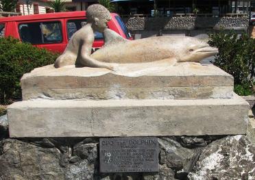 "Boy on a Dolphin" by Rusell Clark, originally erected at Opononi c.1960, now after restoration, lodged in the Historical Society Museum at Omapere, photo courtesy Ken Baker